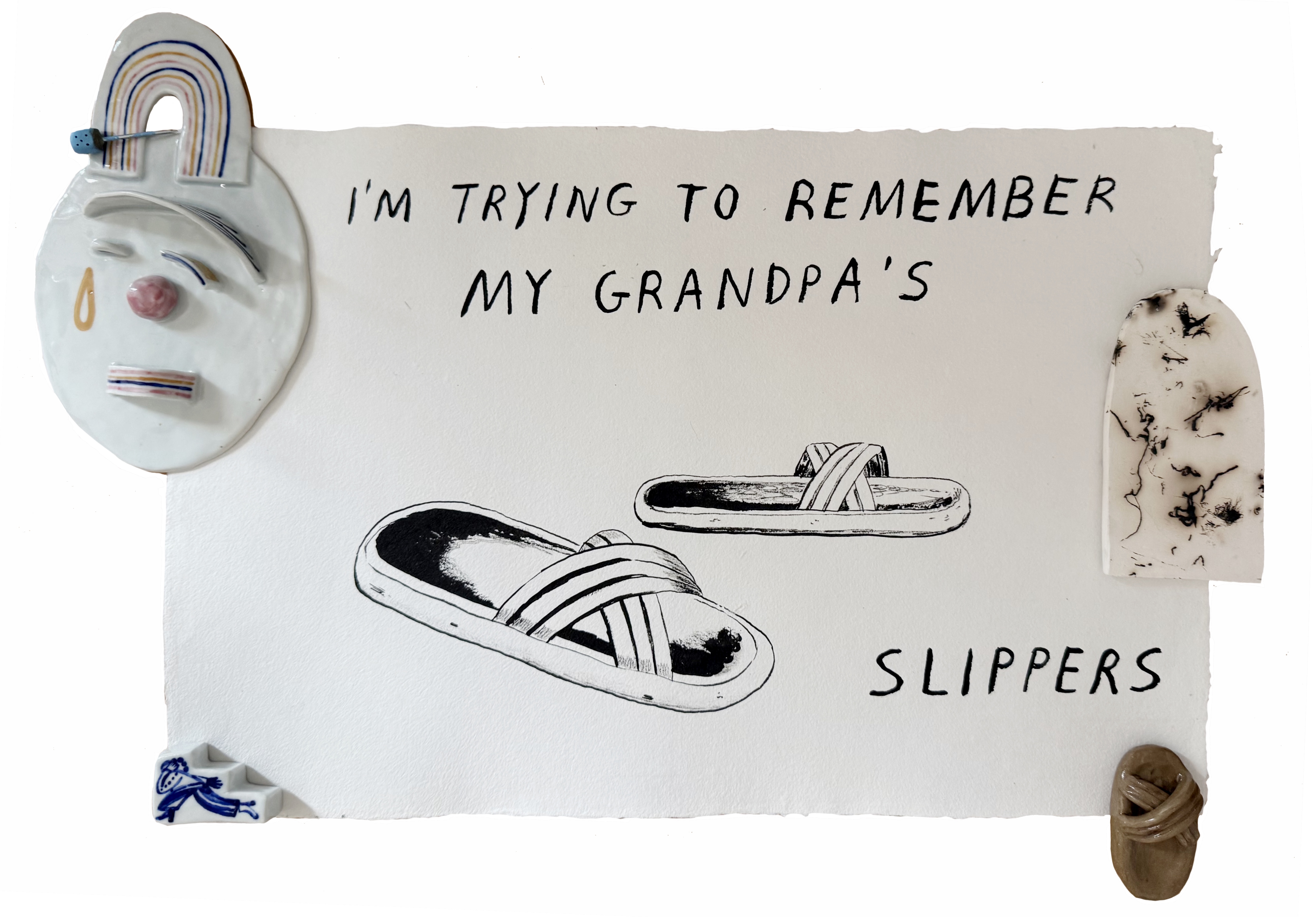 sub wow, slip drawing on stoneware slab with gouache and pencil on handmade paper, 2018